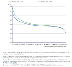 Dans un article publié en 2023, deux chercheurs de l’INSEE, Mathias André et Olivier Meslin, ont montré que la taxe foncière sur la propriété bâtie (TFPB) est un impôt régressif, c’est-à-dire que « Le taux apparent d’imposition du patrimoine immobilier, c’est-à-dire la taxe foncière rapportée à la valeur du patrimoine immobilier brut des ménages propriétaires, diminue au fur et à mesure que le patrimoine immobilier brut des ménages augmente ». Ils utilisent pour cela une nouvelle source statistique (cf. encadré 1) et une méthode innovante d’estimation des prix immobiliers. Les résultats présentés ci-après (en italiques) sont extraits de leur étude[3].