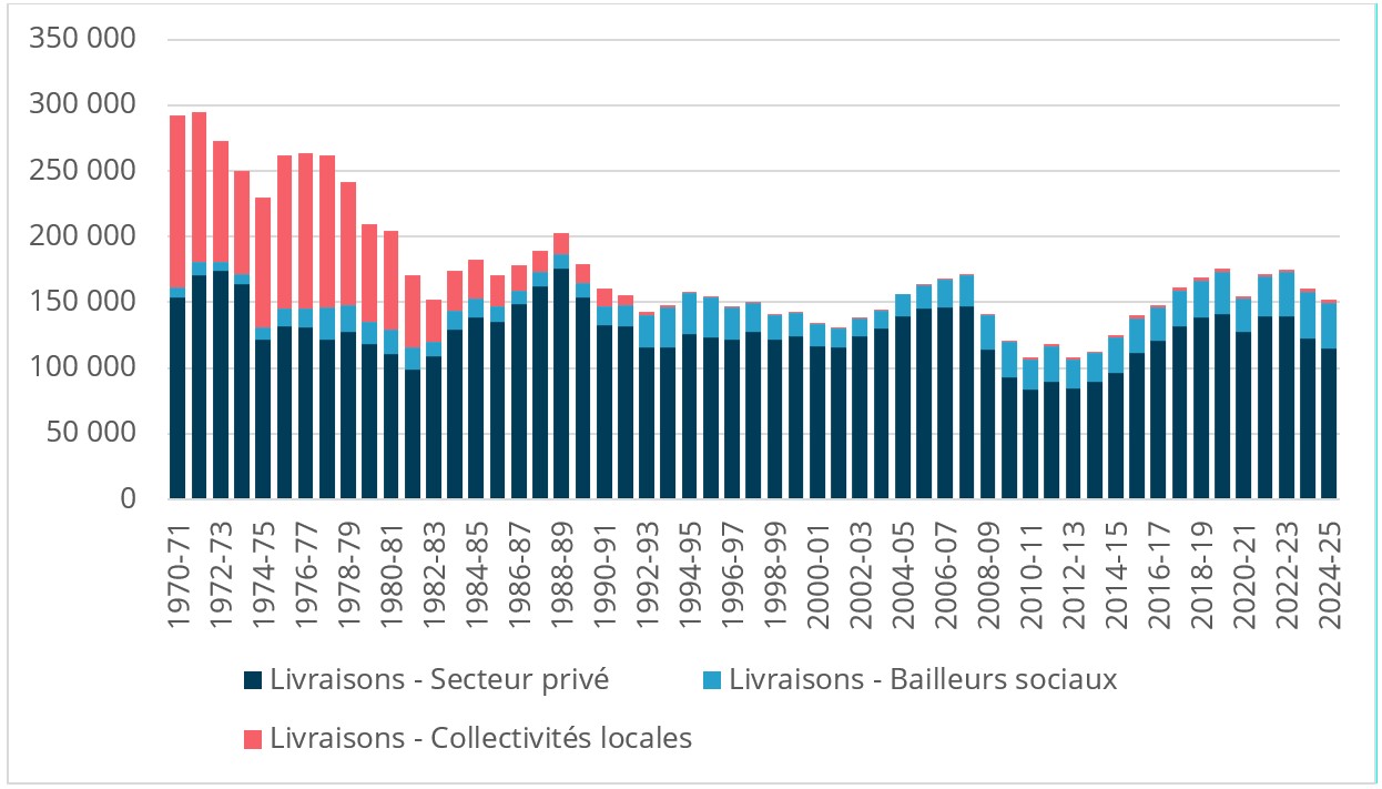 L’origine de la pénurie actuelle est ancienne. Elle remonte à l’immédiat après-guerre où deux changements ont affecté la politique du logement. Le premier concerne la loi sur la planification urbaine (Town and Country Planning Act) de 1947, qui a institué un système de planification permettant l’octroi discrétionnaire des permis de construire, toujours en vigueur. Le second est l’accent mis presque exclusivement sur le développement du logement public (council housing), motivé notamment par l’éradication des taudis des centres-villes, qui a représenté à cette époque près de la moitié de la construction neuve, mais dont la production s’est ralentie à partir des années 1970 et qui a ensuite été affecté par l’introduction du right to buy en 1980[3]. À la différence d’autres pays européens, le secteur privé n’a pas bénéficié d’aides à la pierre : non seulement il n’a pas été en mesure de prendre le relais, mais sa production n’a jamais retrouvé le niveau des années 1970 (cf. figure 1).