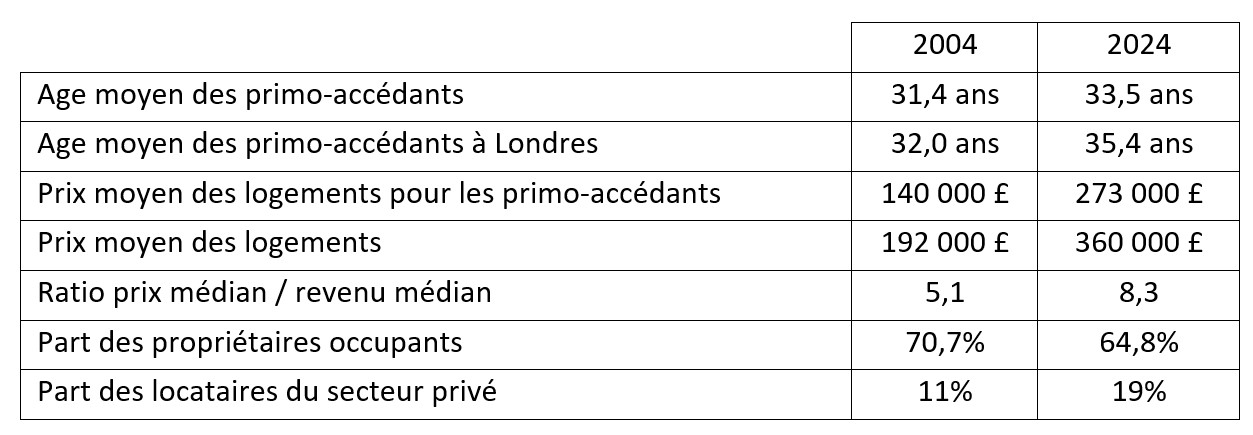 Ce constat n’est pas récent : il était déjà formulé dans le rapport Barker, commandé par le gouvernement travailliste de Tony Blair et publié en 2004. Certaines des mesures qu’il préconisait ont été mises en œuvre, mais elles n’ont pas suffi à juguler la crise, comme en témoigne un bilan établi vingt ans après par la Home Builders Federation (la fédération du bâtiment d’Angleterre et du Pays de Galles)[11]. Le déficit de logements a continué à s’accroître et, comme le montre le tableau ci-dessous (cf. figure 2) qui en est extrait, le prix des logements a fortement augmenté, l’accession à la propriété est devenue moins abordable, la part des propriétaires occupants s’est réduite et celle des locataires du secteur privé s’est fortement accrue.